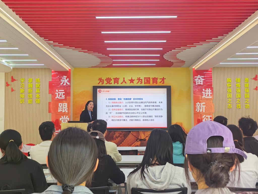 邓洁琼同志聚焦现实,介绍了党的十八大以来反腐败斗争取得的成就,并结合“清廉广西”、“清廉学校”的建设要求,展示了学校推进“清廉桂工”的实践成果。学校通过实施“四大工程”、打造“七个单元”等举措,持续优化育人环境,落实立德树人根本任务。邓洁琼同志号召青年党员要筑牢思想根基、严守行为底线,牢记习近平总书记嘱托,锤炼意志力与自制力,争做“青春倡廉”的践行者。