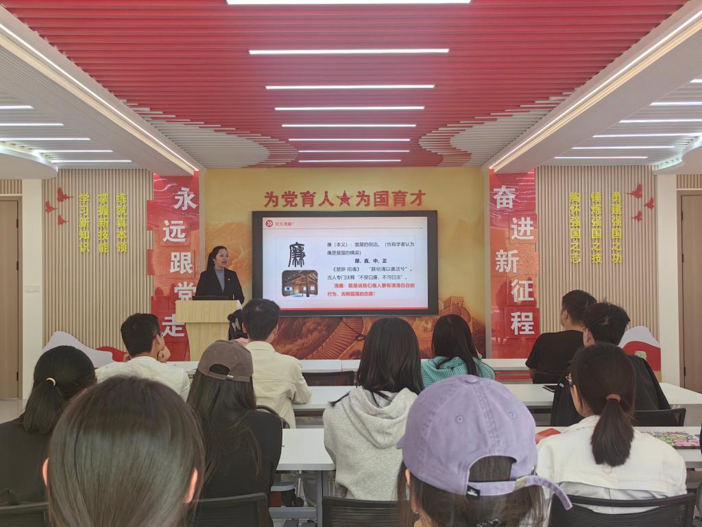为深入学习贯彻习近平新时代中国特色社会主义思想,扎实推进新时代廉洁文化建设,引导青年党员扣好廉洁自律的“第一粒扣子”,2025年11月13日,外国语乐鱼(中国)官方本科生第一党支部在4B思政大讲堂开展了以“崇廉尚洁树新风,砥砺奋进新时代”为主题的第四季度党课,由支部书记邓洁琼同志主讲。