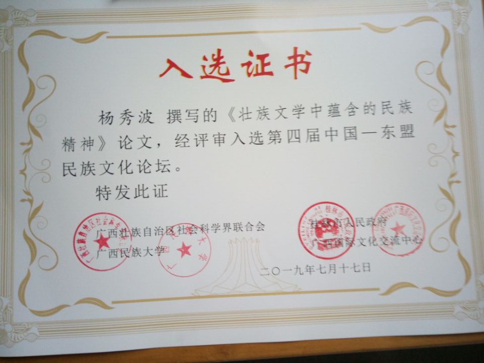 7月16-19日,第四届中国—东盟民族文化论坛在桂林举行,我院杨秀波老师参加了会议,论文入选第四届中国—东盟民族文化论坛。