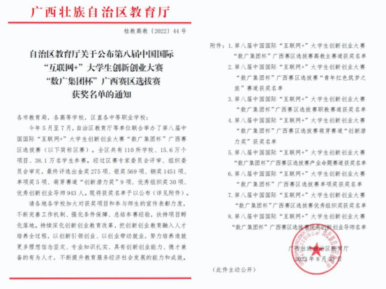 近日,自治区教育厅发布了《乐鱼网页版公布第八届中国国际“互联网”大学生创新创业大赛“数广集团杯”广西赛区选拔赛获奖名单的通知》(桂教高教〔2022〕44号),我院3个重点项目《桂有佳园yell你享——向世界秀出壮乡田园》、《来“柘”里——体验农情惬意绿色共享农庄》、《点缘——让优质珠宝飞入寻常百姓家》最终斩获高教主赛道银奖1项、铜奖1项以及“青年红色筑梦之旅”赛道银奖1项共2银1铜的历史最好成绩,也是我院参加此类大赛首次在区赛上获奖。