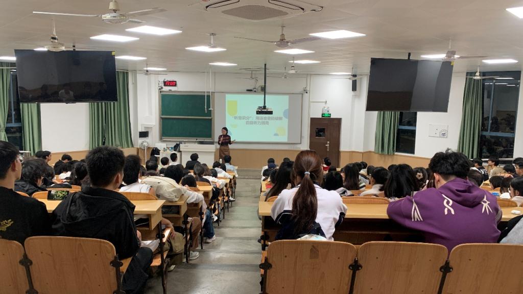 为帮助学生攻克大学英语四级听力难点,提升英语听力理解能力,外国语乐鱼(中国)官方于11月11日19:00在雁山校区4110教室举办了2025年秋季学期大学英语学习系列讲座第五场:听音识分:用语音密码破解四级听力困局。本次讲座由外国语乐鱼(中国)官方张娜老师主讲,两百余名学生到场聆听。