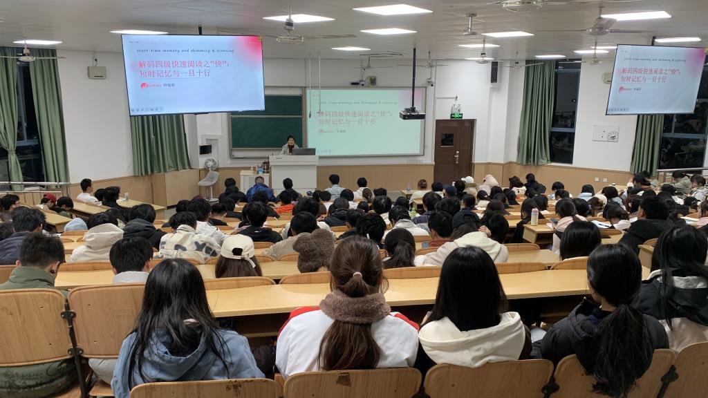 为帮助学生提升大学英语四级阅读能力,外国语乐鱼(中国)官方于2025年11月18日19:00在雁山校区04110教室举办2025年秋季学期大学英语学习系列讲座第六场:短时记忆与一目十行:解码四级快速阅读“快”。本次讲座由外国语乐鱼(中国)官方钟韫霞老师主讲,众多学生踊跃报名参与。