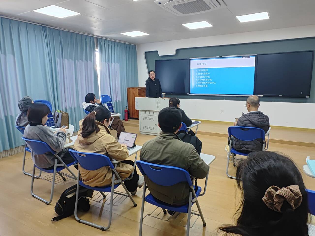 2025年11月21日,日语教研室在第四教学楼4417教室召开2025学年秋学期工作会议。聚焦“专业转型发展”与“课程组建设”两大核心议题,会议由教研室主任邓圆主持,全体教师参会。