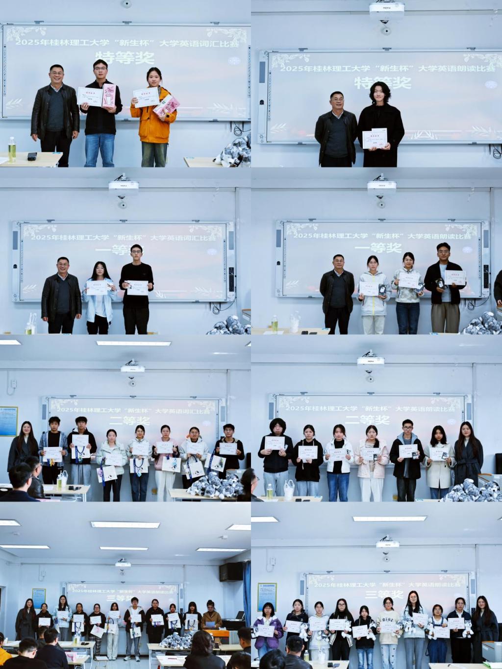 2025年12月19日下午,2025年桂林理工大学“新生杯”大学英语词汇和朗读比赛颁奖仪式在雁山校区4305会议室隆重举行。外国语乐鱼(中国)官方分管大学英语教学的韦运会副院长出席颁奖仪式,基础英语教研室主任王建燕、基础英语教研室副主任房心悦及获奖学生参加了本次活动。颁奖仪式由应用英语教研室副主任刘文戈主持。